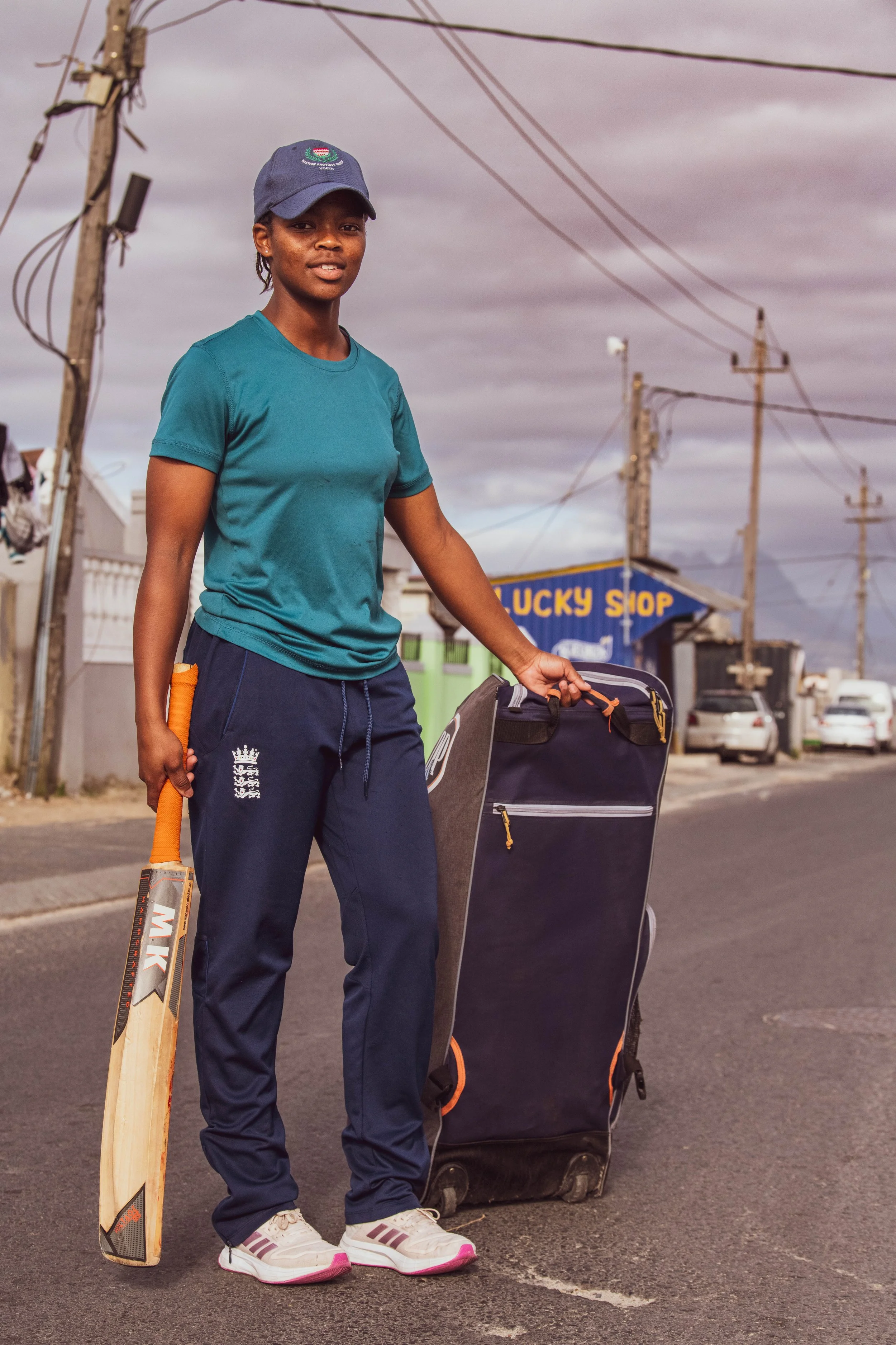 A young woman standing outdoors on a street, holding a cricket bat in her right hand and a large rolling suitcase in her left. She is wearing a blue cap, a teal T-shirt, navy blue pants, and white athletic shoes. The background shows utility poles, power lines, and a small shop with a sign that reads 'LUCKY SHOP.' The sky is cloudy.